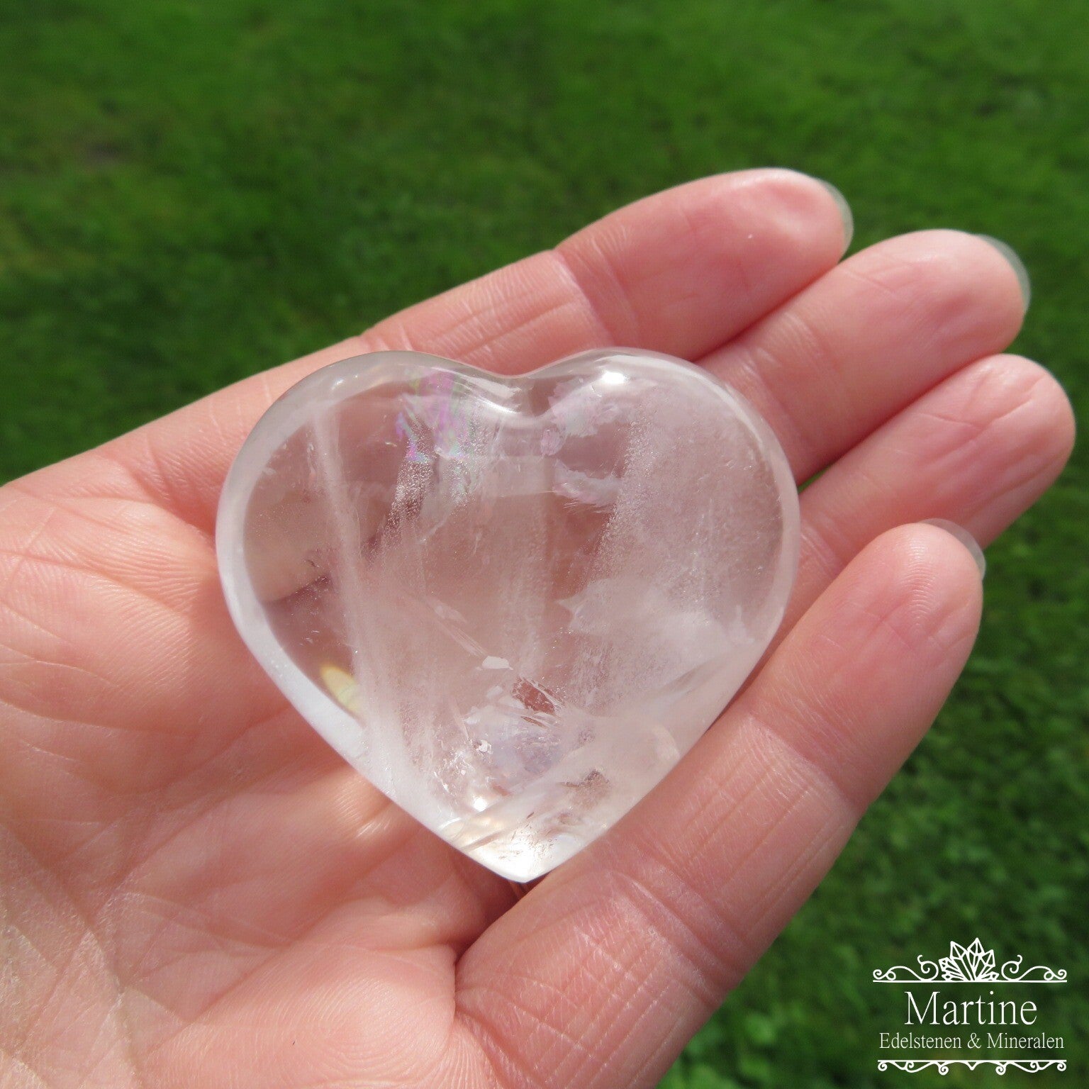 Mooie kwaliteit Bergkristal hart met regenboogjes erin.