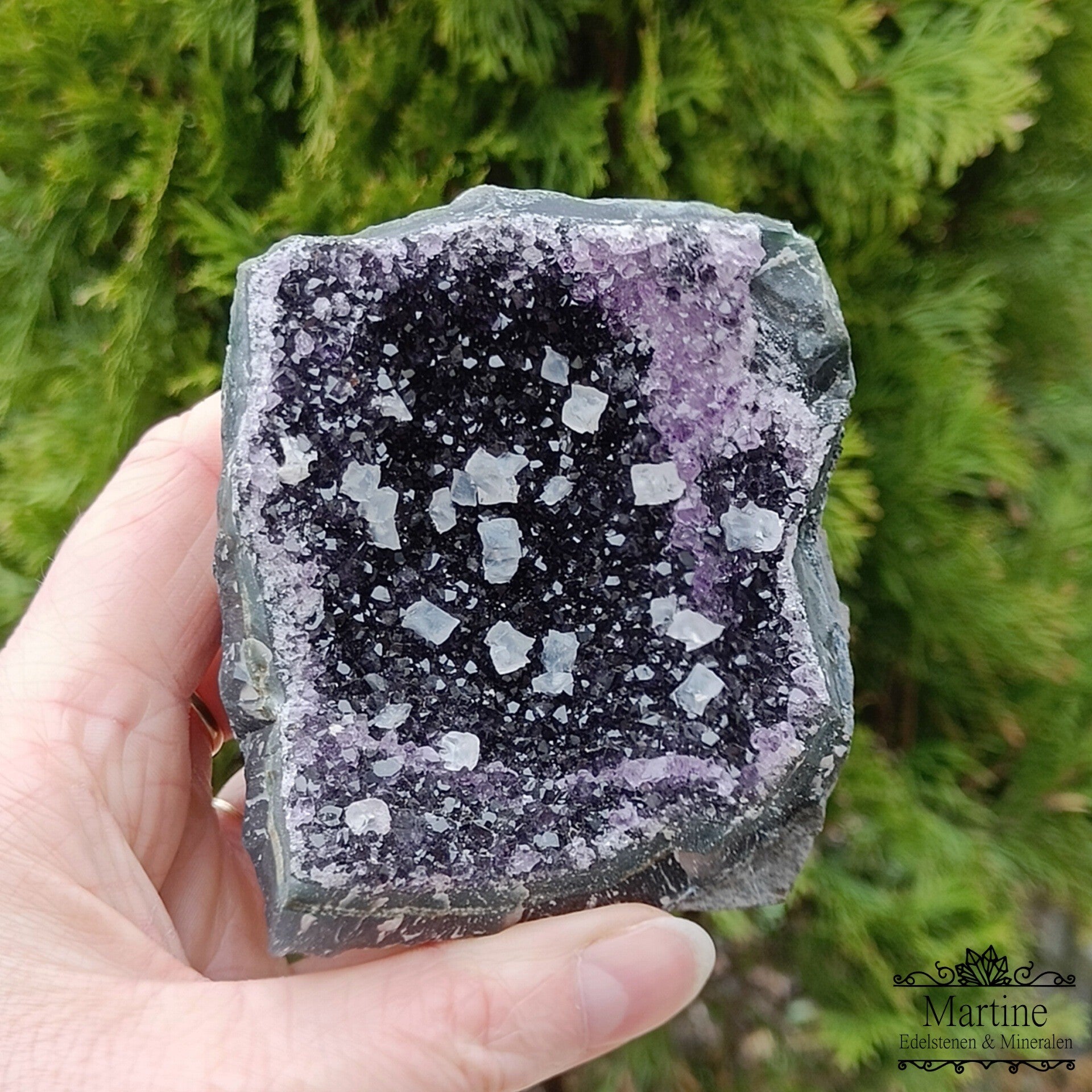 Deze Amethist heeft hele mooie diep donker paarse kristallen met daarop Calciet kristallen. Bijzonder stuk.