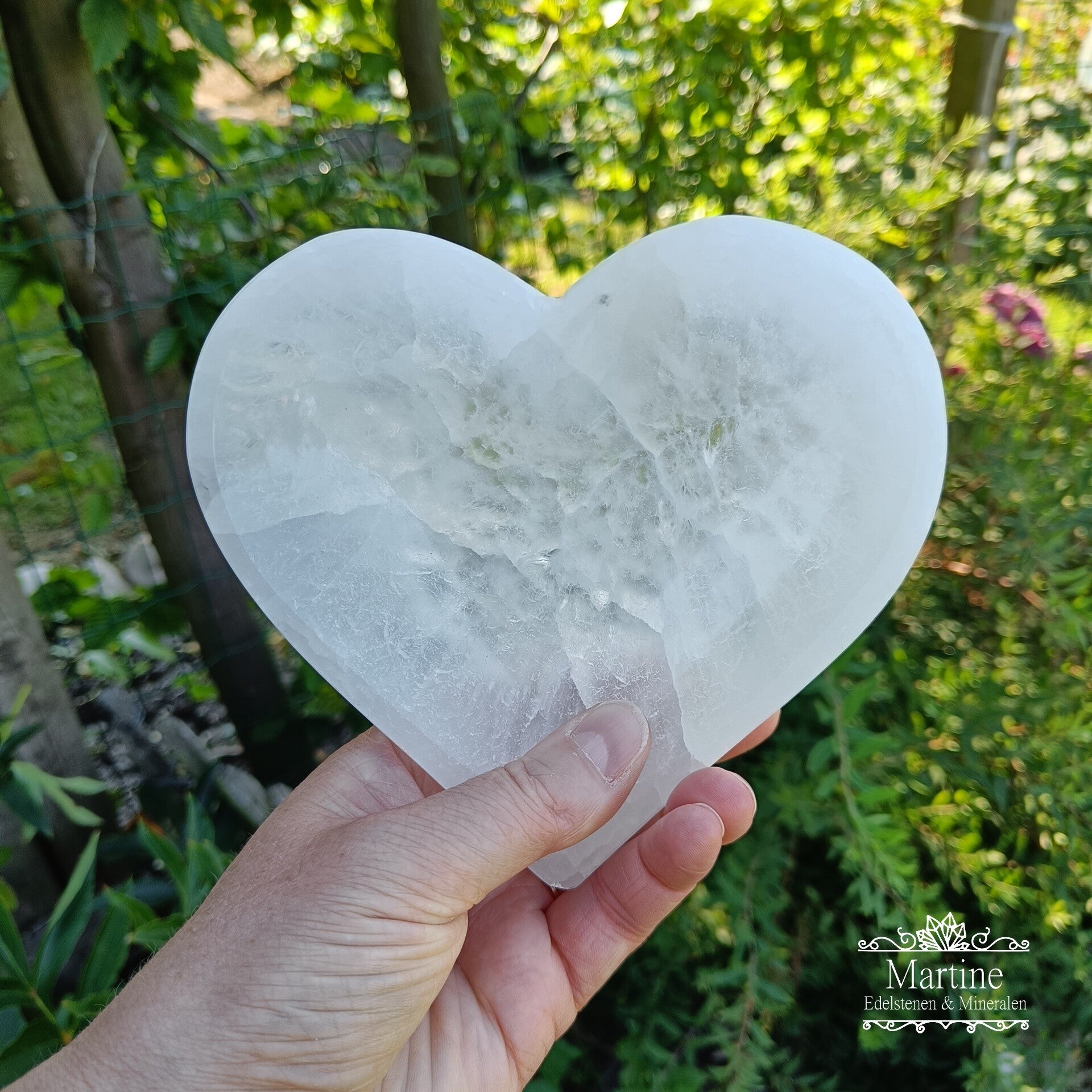Hartvormige Seleniet (Satijnspaat) schaal ideaal om kleine steentjes, armbandjes, hangers of oorbellen in te leggen en door de ladende werking van Seleniet weer op te laden. Het formaat van de schaal is ± 15 cm.