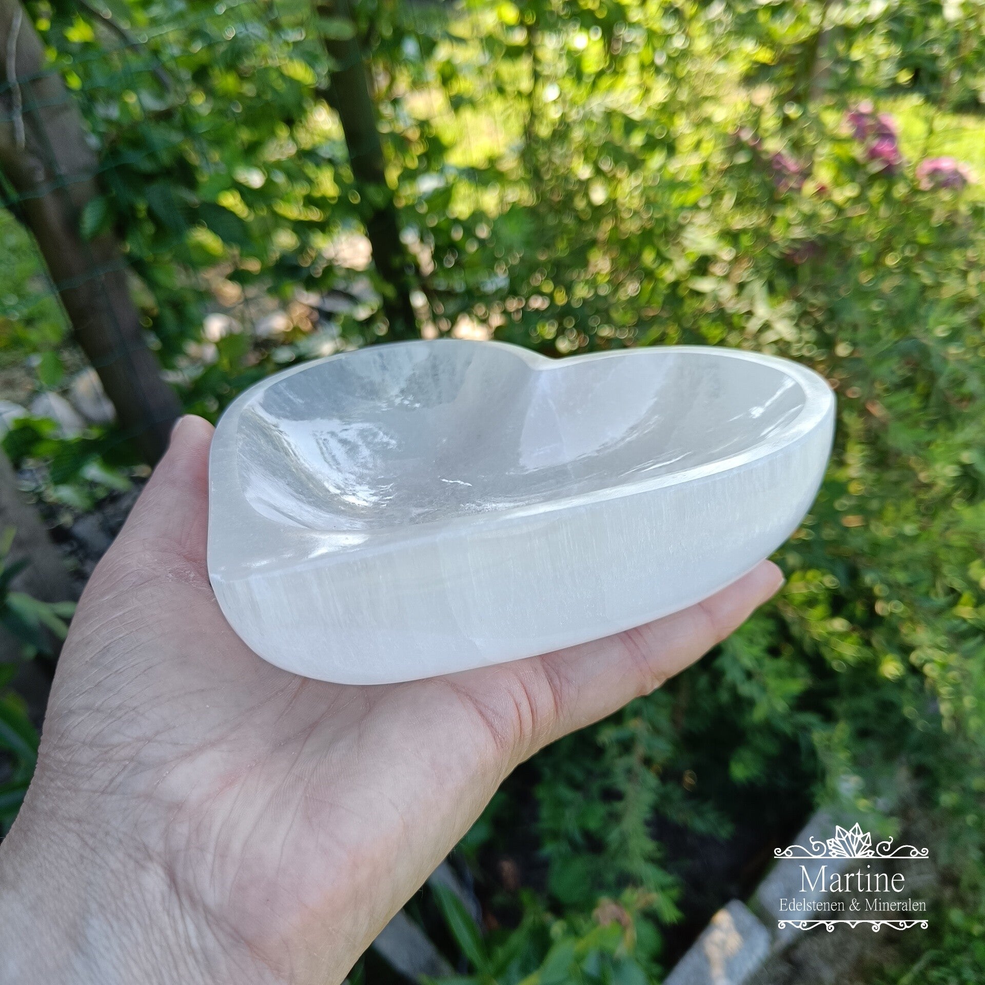 Hartvormige Seleniet (Satijnspaat) schaal ideaal om kleine steentjes, armbandjes, hangers of oorbellen in te leggen en door de ladende werking van Seleniet weer op te laden. Het formaat van de schaal is ± 15,5 cm.