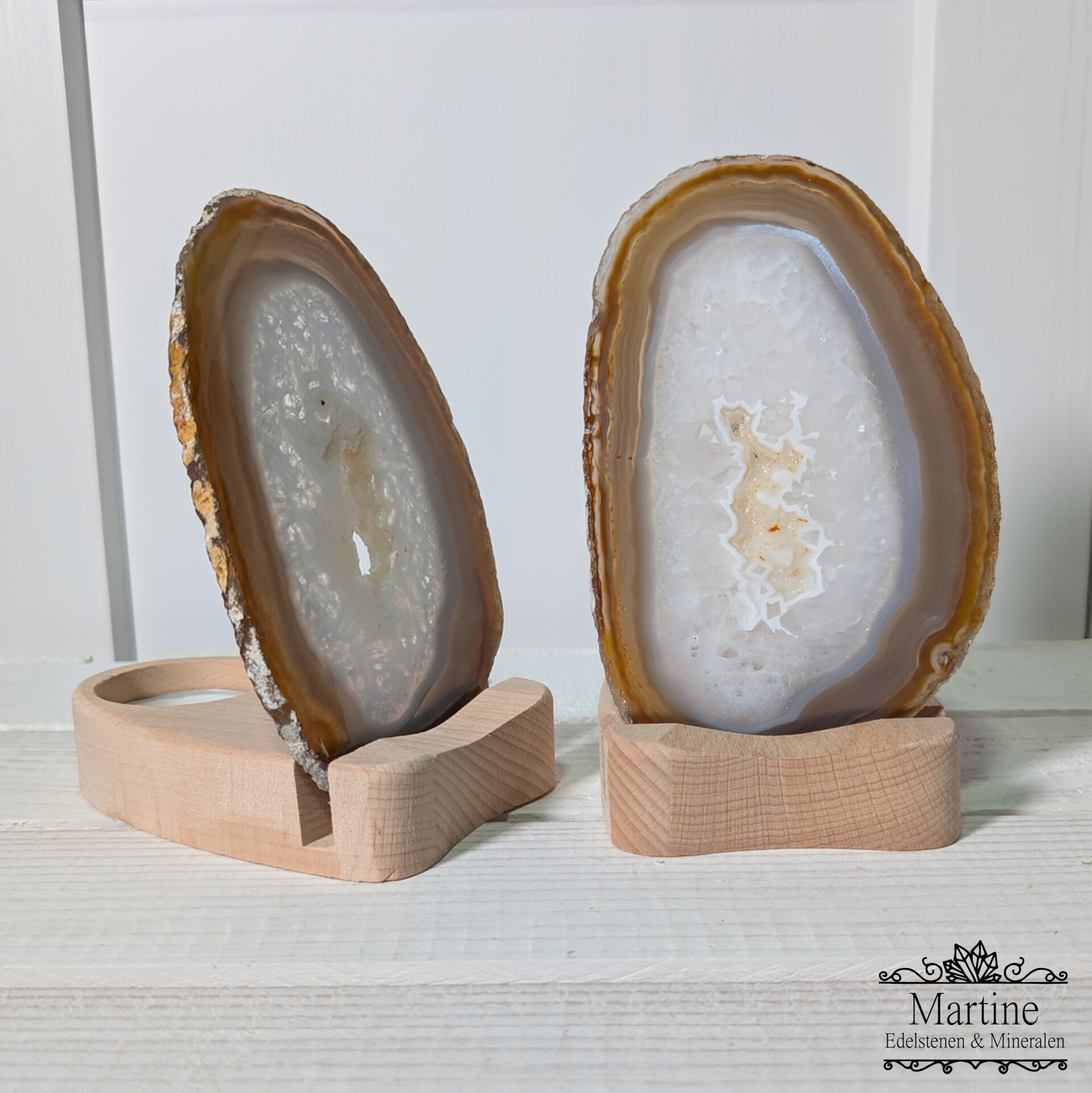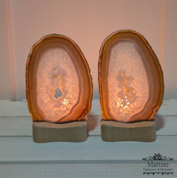 Deze set bestaat uit 2 houten Agaat schijf houders met waxinelichtje en 2 unieke Agaat schijven. Het bijzondere aan deze set is dat de Agaat schijven uit hetzelfde stuk zijn gezaagd, een echt duo dus!