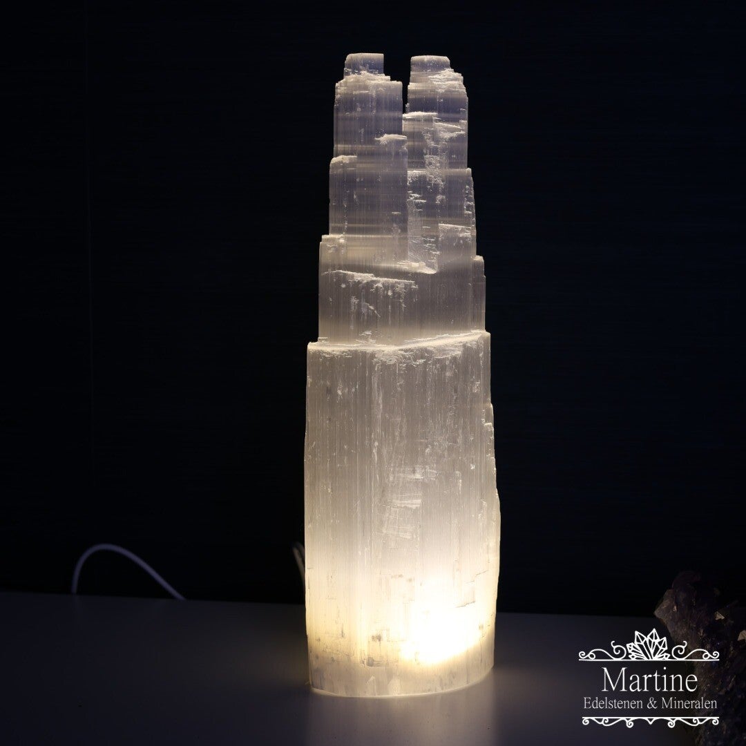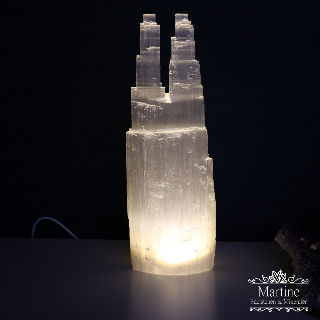 Seleniet / Satijnspaat lamp, model ijsberg dubbele toren.