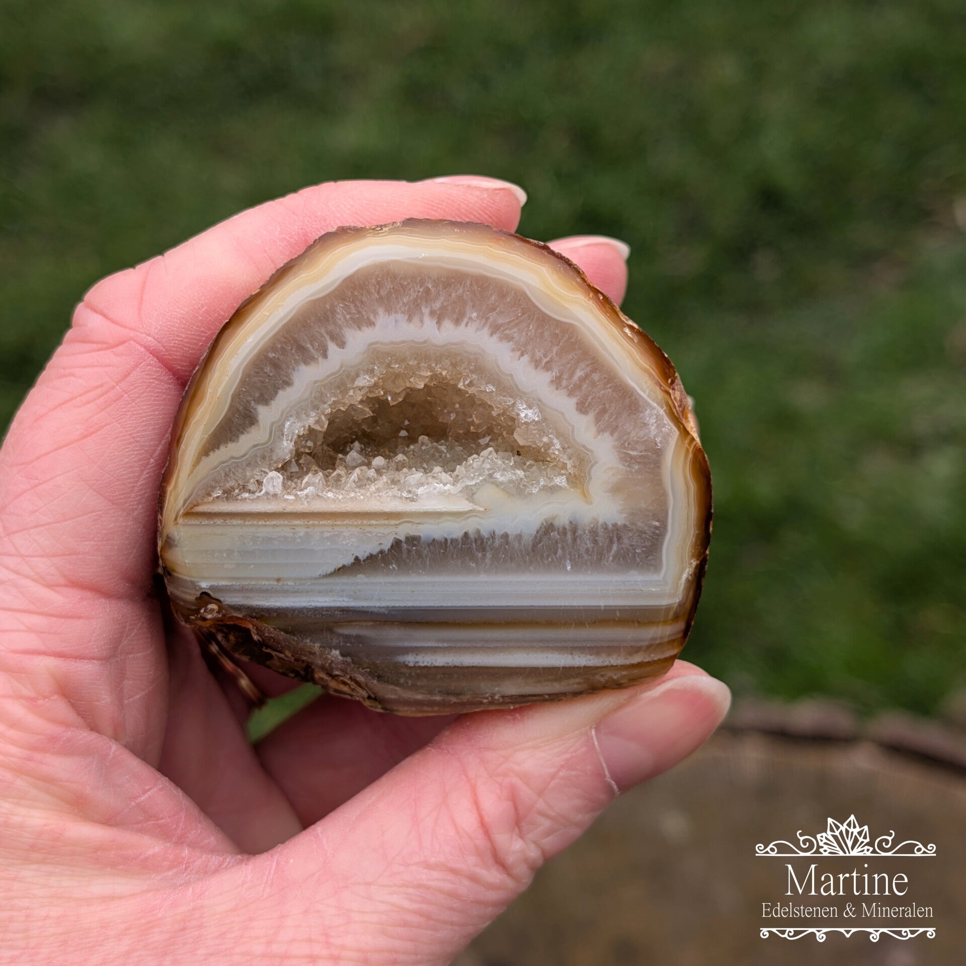 Agaat geode paar met een kern vol glinsterende kwarts kristallen.